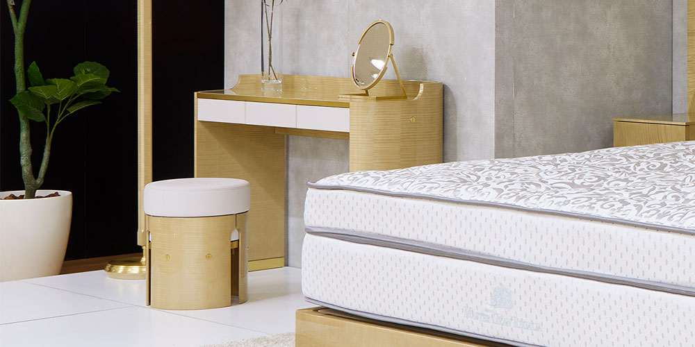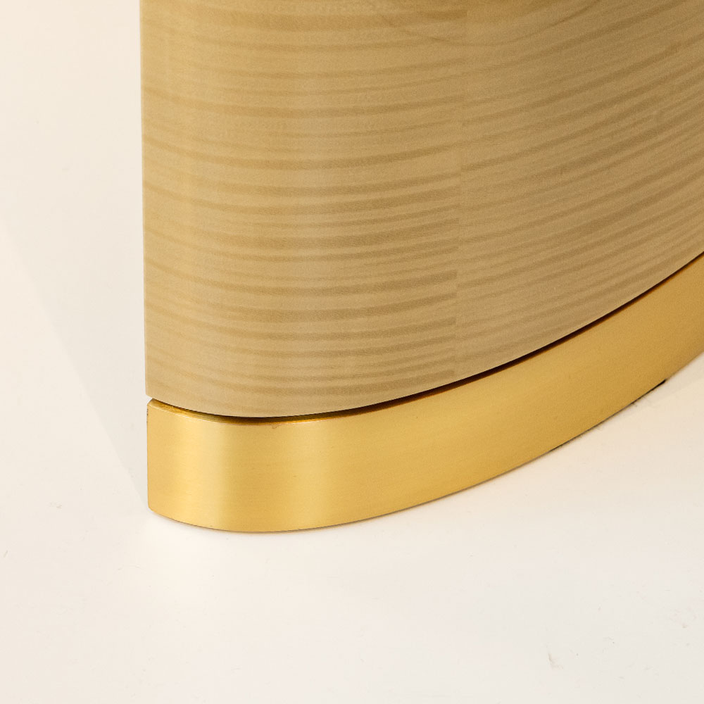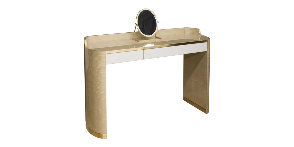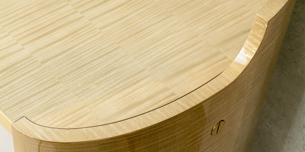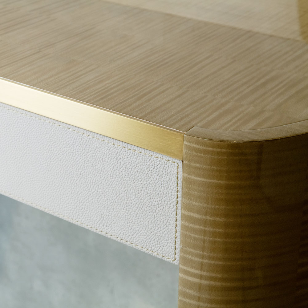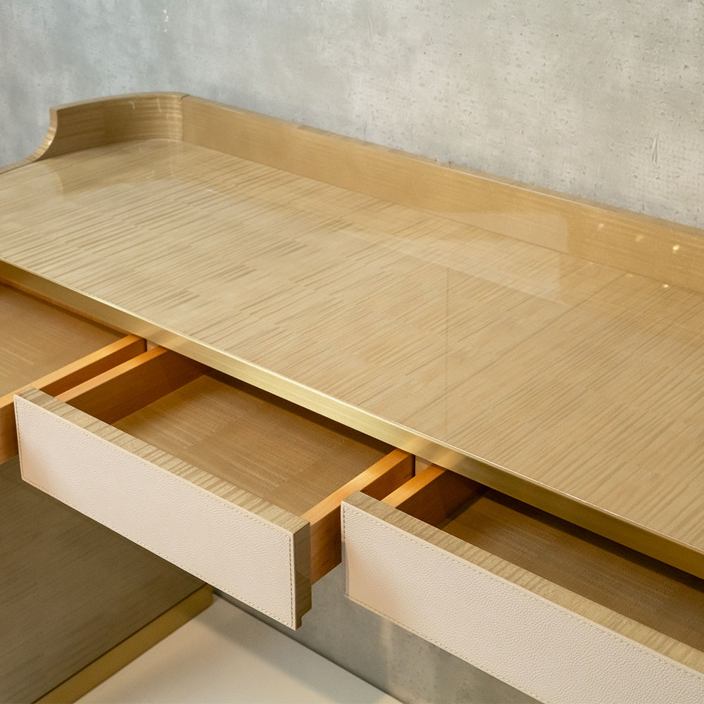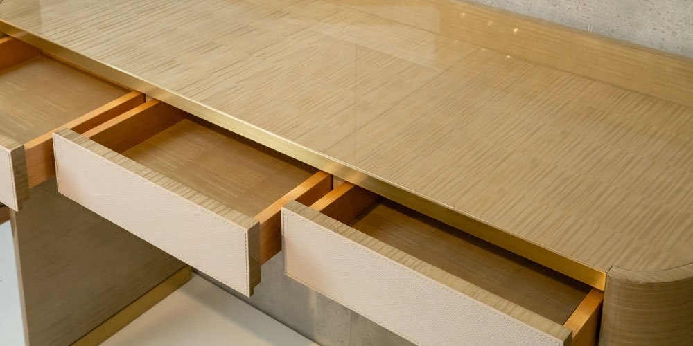 シカモアをベースに、レザーとゴールドのアクセントを効かせたエレガントなドレッサーです。京漆の技法を生かし、ポリエステル樹脂を漆塗りのように何層にも重ね塗りを行う鏡面仕上げがシカモアの美しさを引き立てています。
