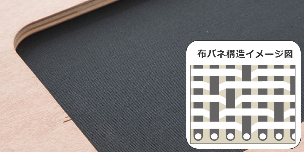 座面には、2種類の特殊な糸を密度の高い織り方で製造した伸縮性のある布製のバネを使用しています。布バネは、荷重を面で支えるため微妙な体の凹凸にもフィットし、優れた耐圧分散性と底付き感のない座り心地が得られます。※画像はイメージです。