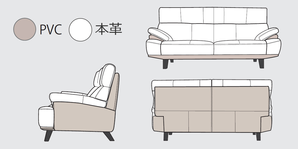 座面・背もたれ・肘かけの身体が直接触れる部分には本革使用し、背面・肘かけ外側などには合成皮革(PVC)を使用しています。